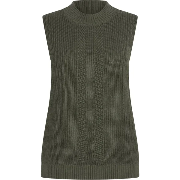 Gebreide mouwloze trui * Hoge kraag * Halve veststeek * Ribgebreide zoom * Metalen badge aan de voorkant 100% Cotton