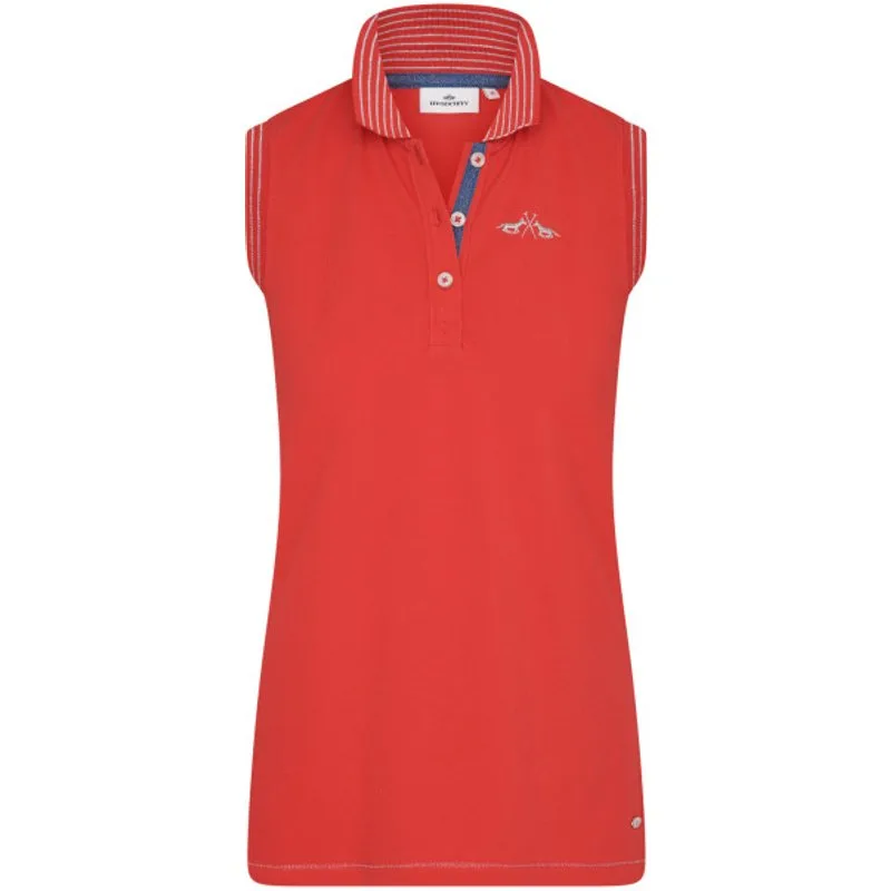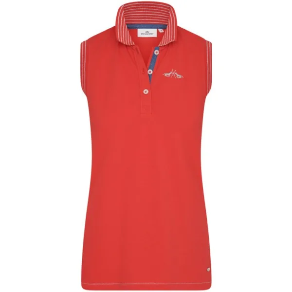 Stijlvol mouwloos poloshirt met meerdere gestreepte afwerkingen op de geribde kraag en de mouwopening. Geborduurd merklogo op de borst en geprint zilveren merklogo op de rug. Denim-lurexband aan de binnenkant van de knooppas. Knoopsluiting met kleine parelmoeren knopen op de knooppas. Merkmuntje links voorop de zoom. 95% cotton 5% elastane