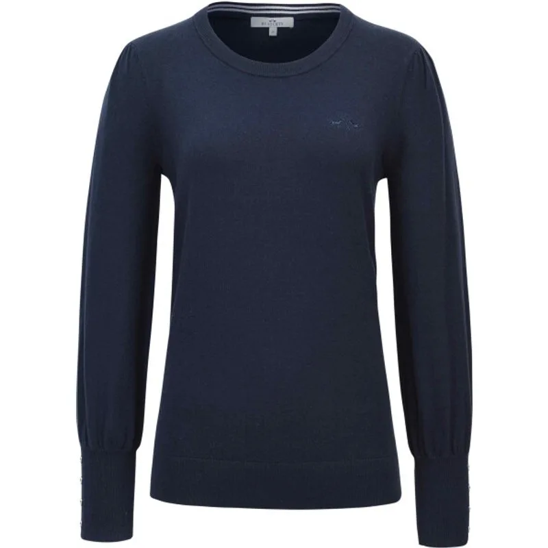 * Gebreide pullover * Ronde hals * Ribboord aan manchetten, onderboord, halslijn en aan de zijkanten * Kleine metalen knopen aan manchet * Kleine plooien op de schouder * Logo-borduursel op de borst * Merk metalen plaatje aan de voorkant 80% cotton 18% polyamide 2% elastan