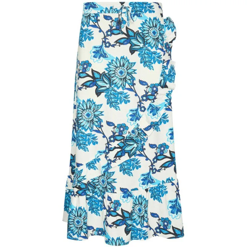 Linnen mix rok met een kleurrijk all-over printje of in blauw Indigo * Net over de knie lengte * Ruches aan de voorkant en onderste zoom * Elastiek binnenin de tailleband voor extra comfort * Koordje binnenin de tailleband om de taille aan te passen 70% viscose 30% linen