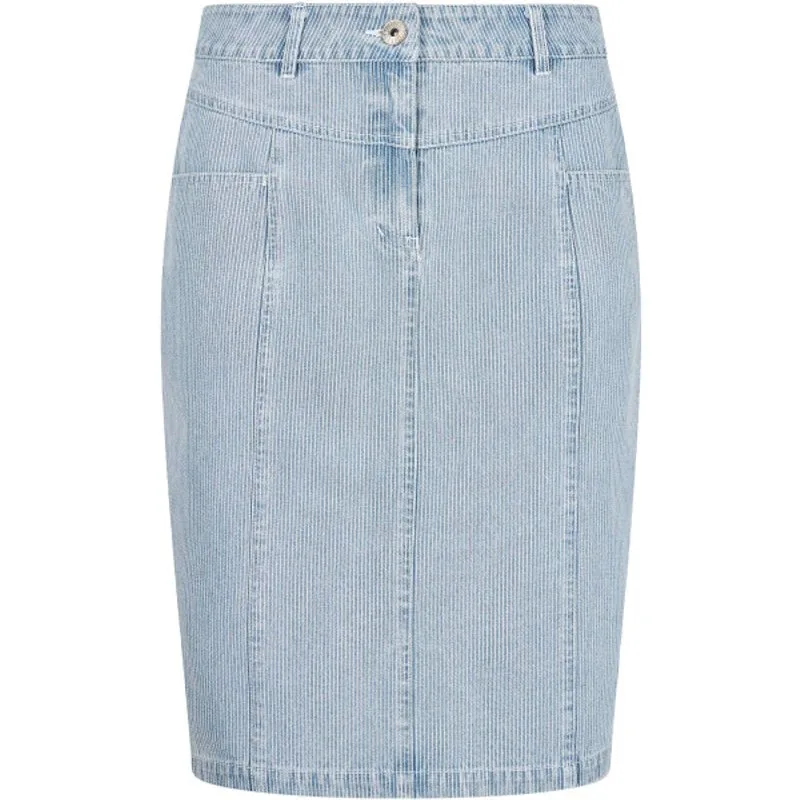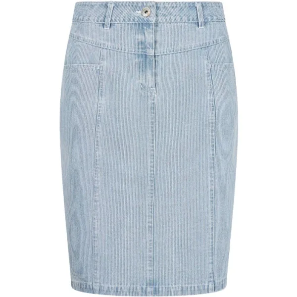 * 5-Pocket rok * Spijkerstof met klein blauw/wit streeppatroon * Voor- en achterpas voor mooie vorm * Jeansknoop met branding en ritssluiting aan de voorkant * Branded rivets op zakken * Strass rivets op voorzakken * Split aan achterzijde * Geborduurd artwork op de tailleband aan de achterkant * Riemlussen bij tailleband 99% cotton 1% elastane