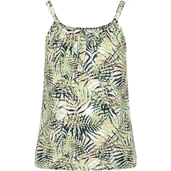 Spaghettitop van stretch jersey. Met koord van dezelfde stof door tunnel aan de voorkant en achterkant van de halslijn om de lengte en nekbreedte van de riem aan te passen. Kleine split aan de voorkant. Metalen plaatje aan de voorkant. 95% viscose 5% elasthan
