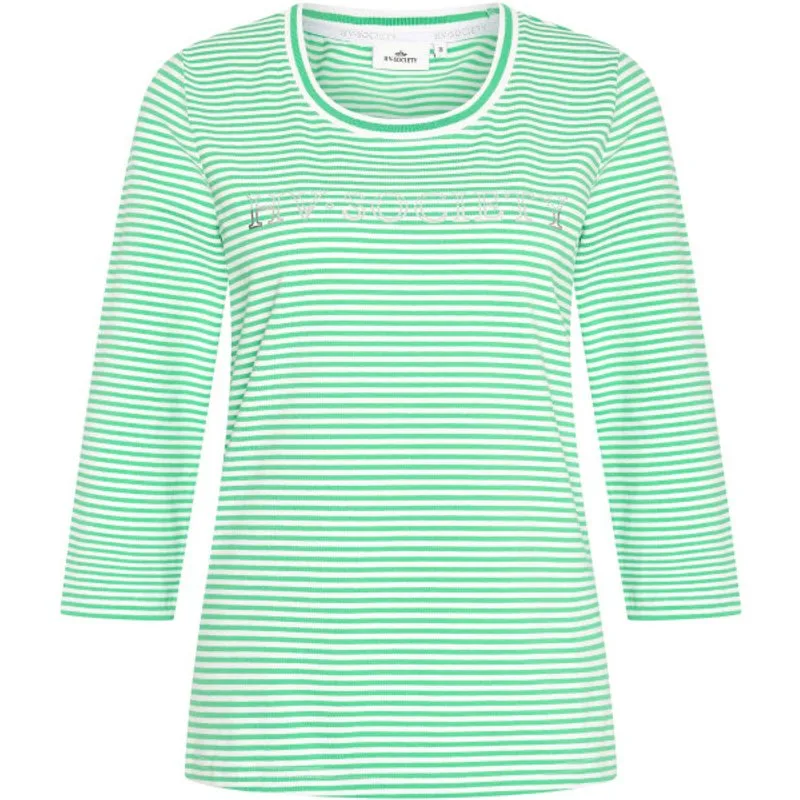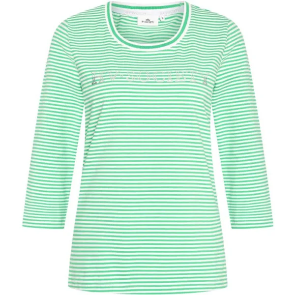 Upgrade je casual garderobe met onze nieuwste toevoeging: de regular fit top met 3/4 mouwen. Gemaakt van gekleurde gestreepte stretch katoenen jersey, biedt deze top niet alleen de perfecte pasvorm, maar zorgt ook voor comfort de hele dag. De ronde hals en de artwork op de borst voegen een vleugje stijl toe, terwijl de fijne ribbel met contraststrepen en het metalen merkplaatje aan de voorkant de algehele uitstraling verhogen. Blijf moeiteloos chique en comfortabel in onze trendy top. 95% cotton 5% elastane