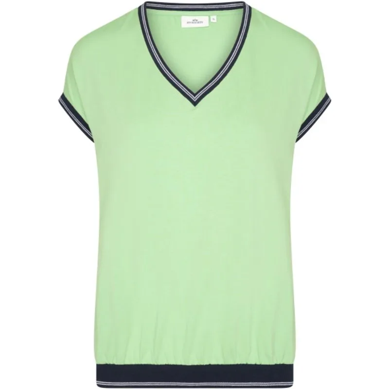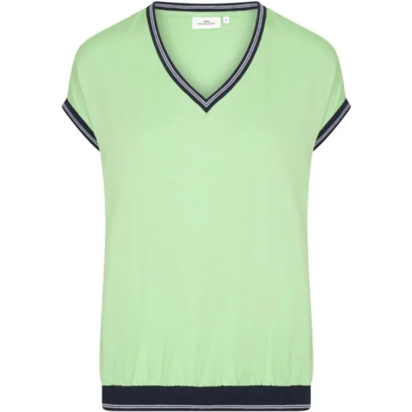 Top van stretch jersey met korte mouwen met aansnijding in effen of all-over print. Ribboord met contraststrepen aan onderkant, mouw en hals. Hals heeft een V-vorm. Metalen plaatje aan de voorkant 95% viscose 5% elastan