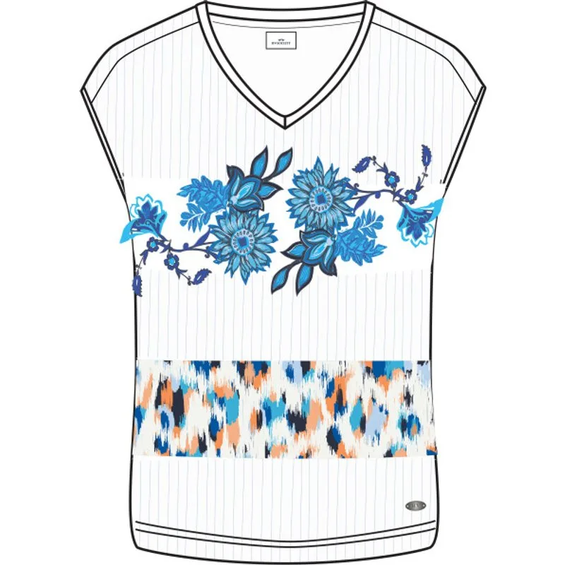Zacht stretch katoenen topje met een kleurrijk all-over printje * V-hals * Klein elastiek onderaan * Merkplaatje onderaan vooraan 95% cotton 5% elastane
