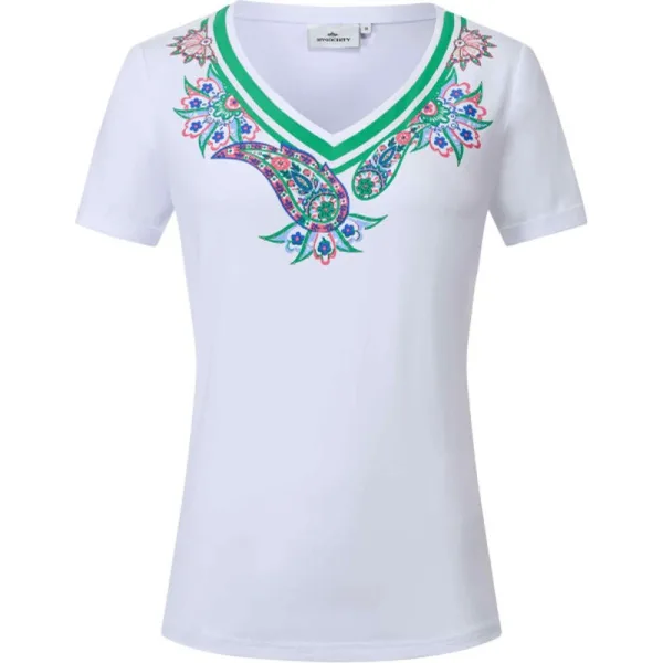 * Top met korte mouwen in stretch katoenen jersey * V-hals * Kleine omslag aan de mouwen * Artwork langs de halslijn aan de voorkant * Merk metalen plaatje aan de voorkant 95% cotton 5% elastane