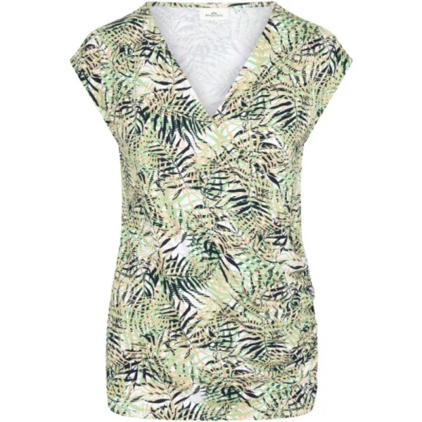 Overslagtop van stretch jersey met korte ingesneden mouwen in een effen of all-over bedrukte versie. Rimpels bij de linker zijnaad van de voorste bovenste deel van de drager. Metalen plaatje aan de voorkant 95% viscose 5% elasthan
