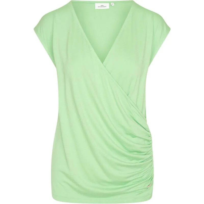 Overslagtop van stretch jersey met korte ingesneden mouwen in een effen of all-over bedrukte versie. Rimpels bij de linker zijnaad van de voorste bovenste deel van de drager. Metalen plaatje aan de voorkant 95% viscose 5% elasthan