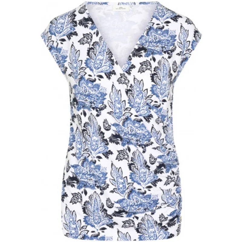 Overslagtop van stretch jersey met korte ingesneden mouwen in een effen of all-over bedrukte versie. Rimpels bij de linker zijnaad van de voorste bovenste deel van de drager. Metalen plaatje aan de voorkant 95% viscose 5% elasthan