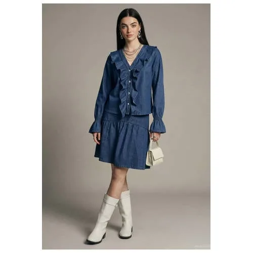 Geef je dagelijkse look een update met deze HYPEDROP damesblouse in medium blue denim. De blouse heeft een rechtvallende pasvorm en een klassieke kraag, waardoor de blouse er verzorgd uitziet en toch relaxed aanvoelt. De lange trompetmouwen en subtiele ruches geven het effen ontwerp een speels accent dat mooi meebeweegt bij iedere stap.Kenmerken van de denim blouse Effen medium blue denim kleur die eenvoudig te combineren is met je favoriete broeken en rokken Gemaakt van 100% katoen, een soepele stof die prettig aanvoelt op de huid Rechtvallende pasvorm voor een relaxed silhouet dat netjes oogt Klassieke kraag en volledige knoopsluiting aan de voorkant Lange trompetmouwen met ruches voor een speels detail Geen zakken voor een rustige, verzorgde uitstraling Maatadvies: dit artikel valt normaal Onderhoud: handwas, niet strijken en niet drogen in de droogtrommelBlouse voor frisse lentedagenDeze blouse past goed bij het lenteseizoen. Draag de blouse losjes over een jeans voor een casual dag of combineer met een nette broek voor een meer aangeklede look. De medium blue denim kleur sluit goed aan bij lichte en neutrale tinten, maar ook bij zwart of donkerblauw.HYPEDROP voor moderne garderobesHYPEDROP richt zich op moderne items die je makkelijk inpast in je bestaande kledingkast. De ontwerpen volgen de trends, maar blijven draagbaar voor elke dag. Met deze blouse kies je voor een basisstuk dat je seizoen na seizoen uit de kast pakt.Een blouse die je garderobe op een rustige en doordachte manier aanvult.
