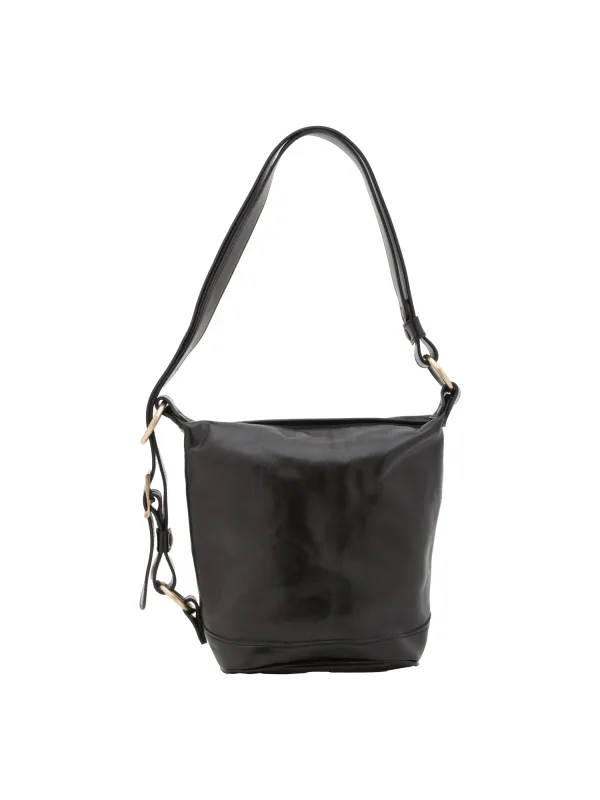 Dames bucketbag met ritssluiting. één met binnenzakken met ritssluiting. afwezige externe zakken. verstelbaar in lederen schouderband. ontbrekend handvat. een binnencompartiment. extern materiaal. gevoerd met katoenen binnenkant. Afmetingen: 25x28x14 cm. Gemaakt in Italië
