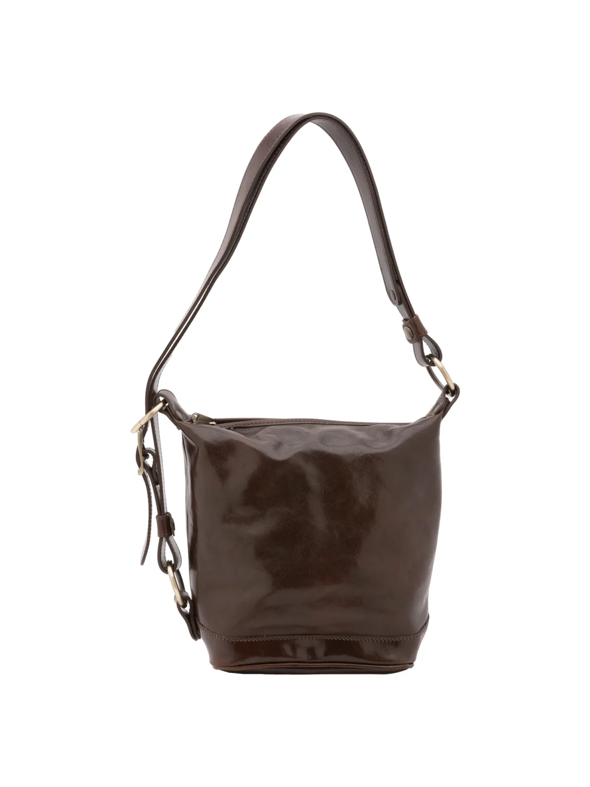 Dames bucketbag met ritssluiting. één met binnenzakken met ritssluiting. afwezige externe zakken. verstelbaar in lederen schouderband. ontbrekend handvat. een binnencompartiment. extern materiaal. gevoerd met katoenen binnenkant. Afmetingen: 25x28x14 cm. Gemaakt in Italië