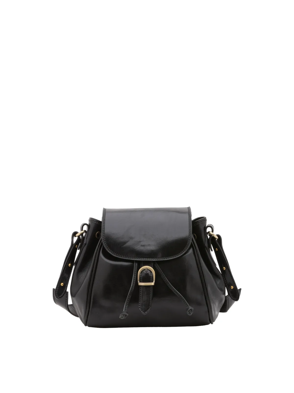 Damesbucketbag met leren trekkoordsluiting. één met binnenzakken met ritssluiting. één achterkant met externe zakken met ritssluiting. ontbrekende schouderband. met leren handvat. een binnencompartiment. extern materiaal. gevoerd met katoenen binnenkant. Afmetingen: 24x24x14 cm. Gemaakt in Italië