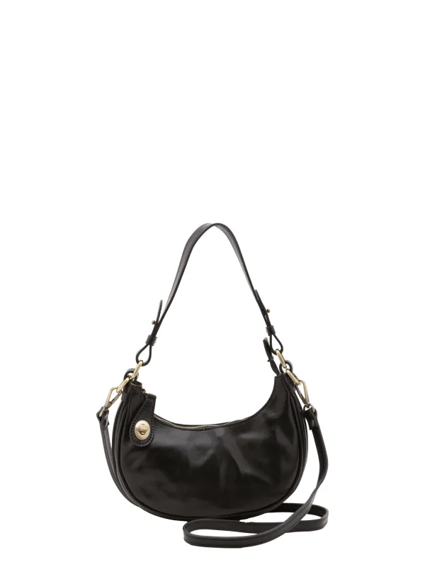 Damesschoudertas met ritssluiting. één met binnenzakken met ritssluiting. één achterkant met externe zakken met ritssluiting. afneembare lederen schouderband. met leren handvat. een binnencompartiment. extern materiaal. gevoerd met katoenen binnenkant. Afmetingen: 25x18x8 cm. Gemaakt in Italië