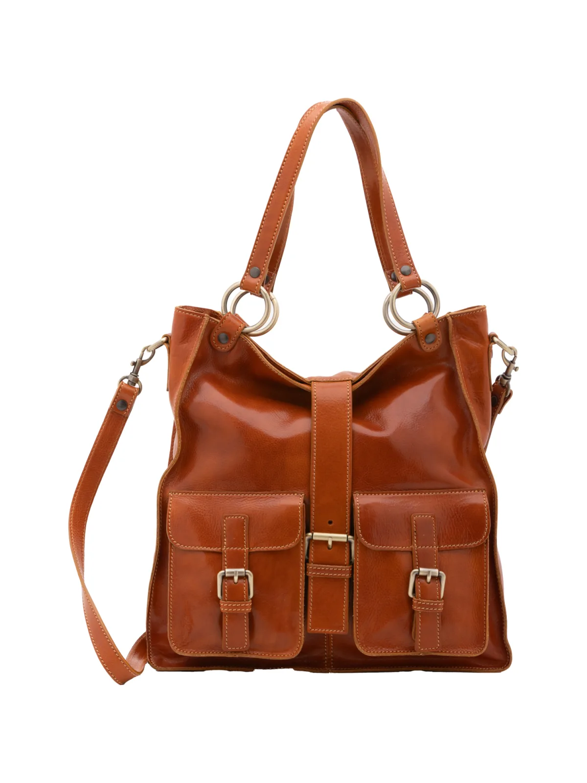 Damesschoudertas met ritssluiting. twee rits- en twee open binnenzakken. één achterkant met externe zakken met ritssluiting. afneembare lederen schouderband. met leren handvat. een binnencompartiment. extern materiaal. gevoerd met katoenen binnenkant. Afmetingen: 38x37x10 cm. Gemaakt in Italië