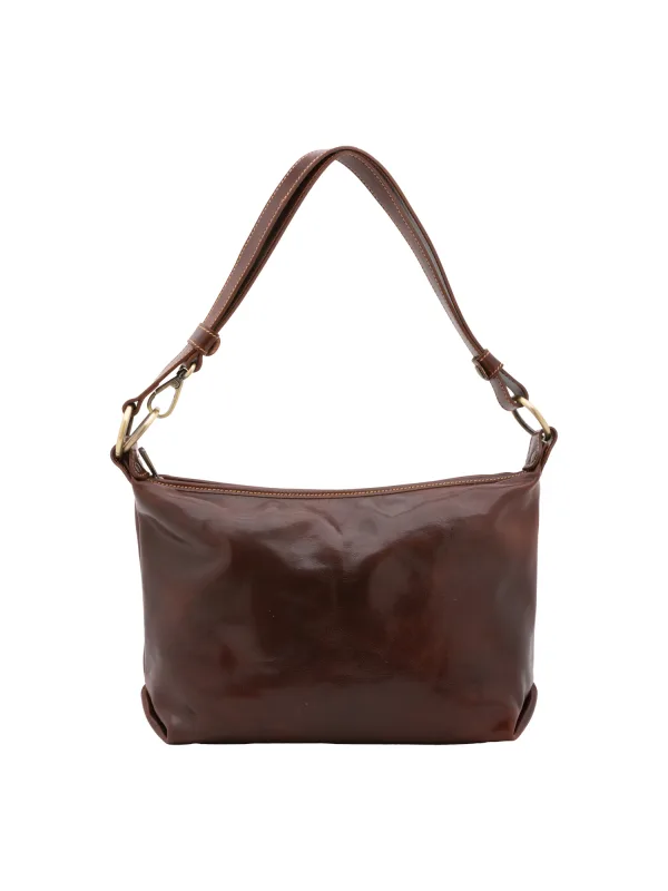 Damesschoudertas met ritssluiting. één met ritssluiting en twee open binnenzakken. afwezige externe zakken. in lederen schouderband. met leren handvat. een binnencompartiment. extern materiaal. gevoerd met katoenen binnenkant. Afmetingen: 38x23x10 cm. Gemaakt in Italië