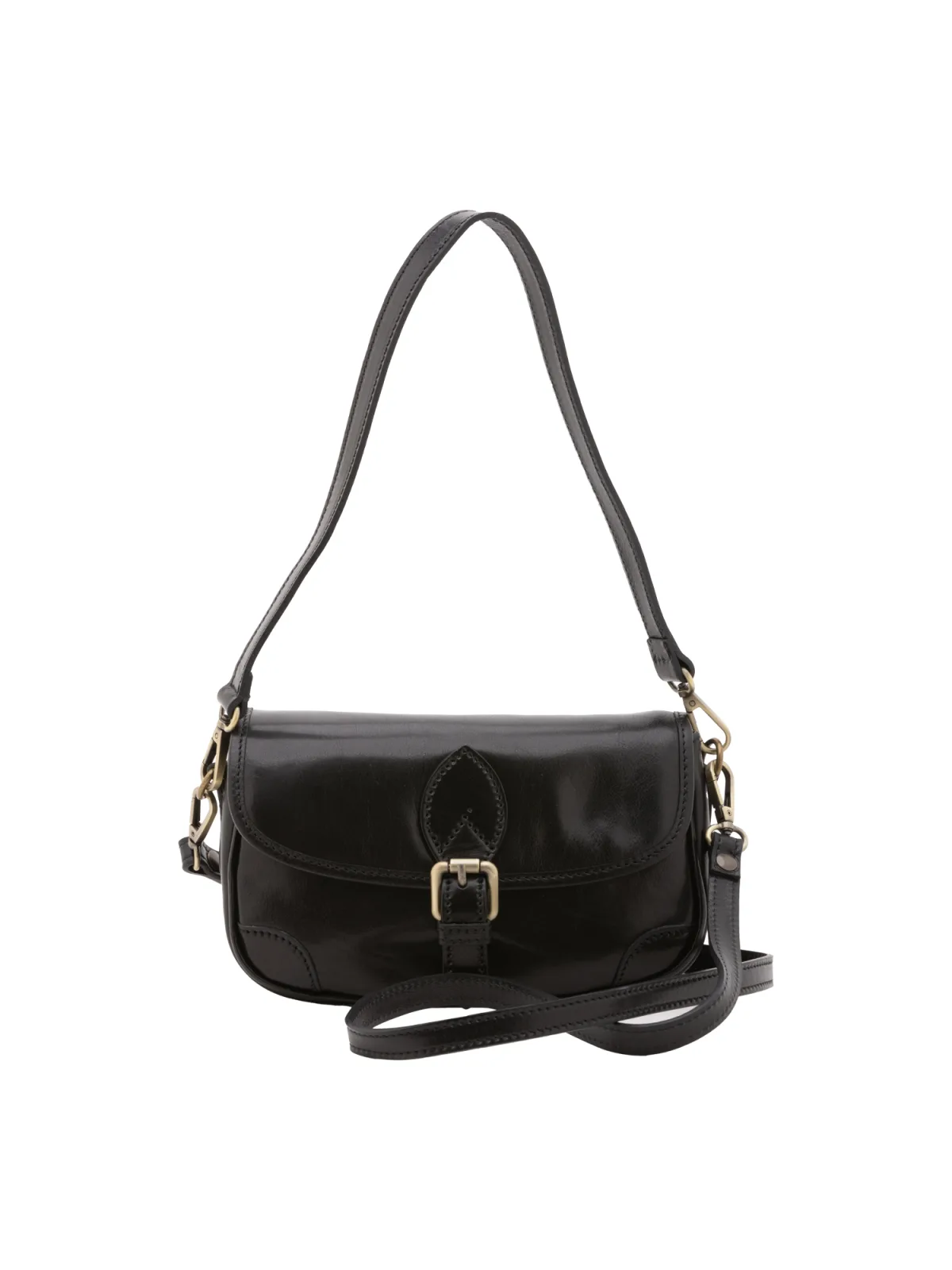Dames schoudertas met magneetsluiting. één met binnenzakken met ritssluiting. één achterkant met externe zakken met ritssluiting. afneembare lederen schouderband. afneembaar leren handvat. een binnencompartiment. extern materiaal. gevoerd met katoenen binnenkant. Afmetingen: 14x23x9 cm. Gemaakt in Italië