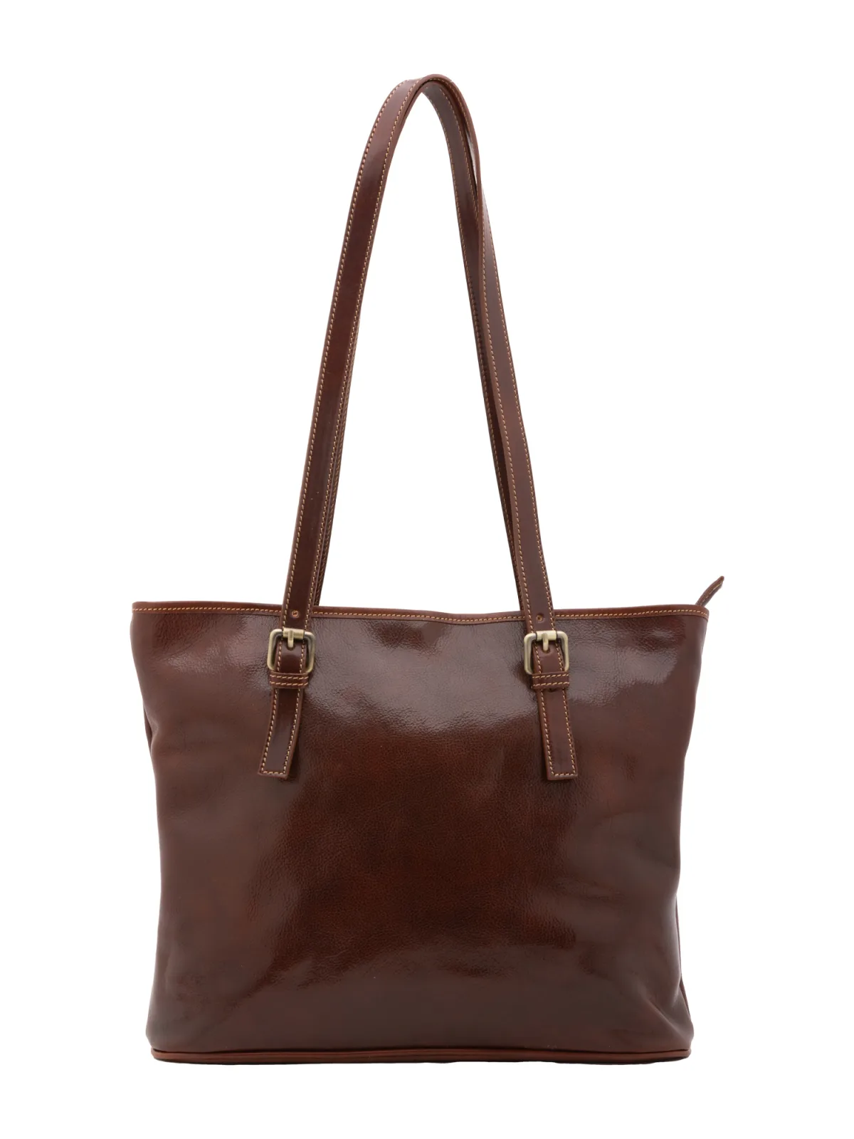 Damesschoudertas met ritssluiting. twee rits- en twee open binnenzakken. één achterkant met externe zakken met ritssluiting. ontbrekende schouderband. met leren handvat. twee binnenvakken. extern materiaal. gevoerd met katoenen binnenkant. Afmetingen: 31x41x10 cm. Gemaakt in Italië