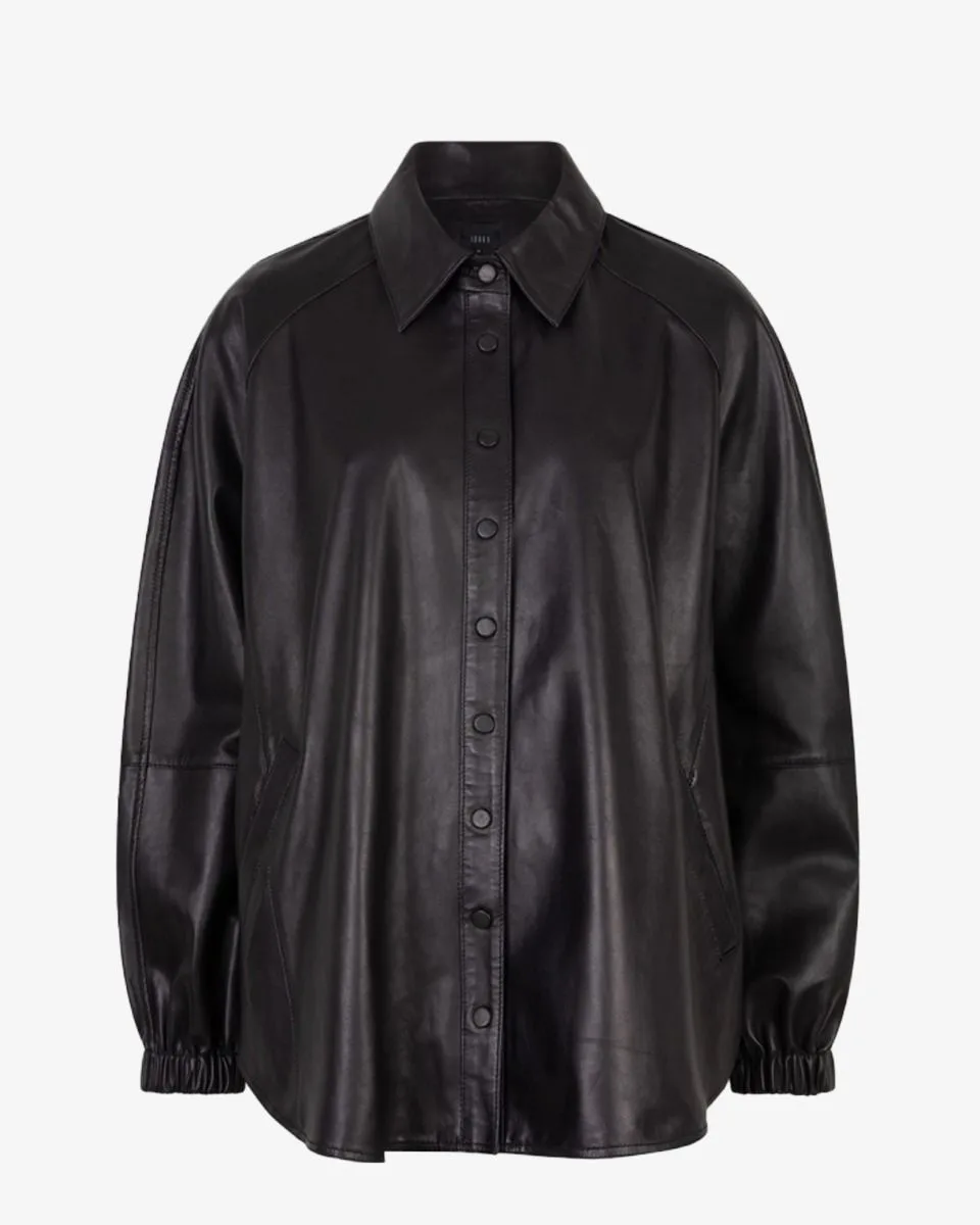 Tijdloos, krachtig en met een moderne touch— de Jessie blouse van Ibana is onmisbaar in je garderobe. De blouse is gemaakt van soepel leer en heeft een wijde pasvorm met een nonchalante uitstraling. De elastische mouwuiteinden zorgen voor volume en een flatterende vorm. Ton-sur-ton drukkers maken dit model compleet. Kleur: zwart.