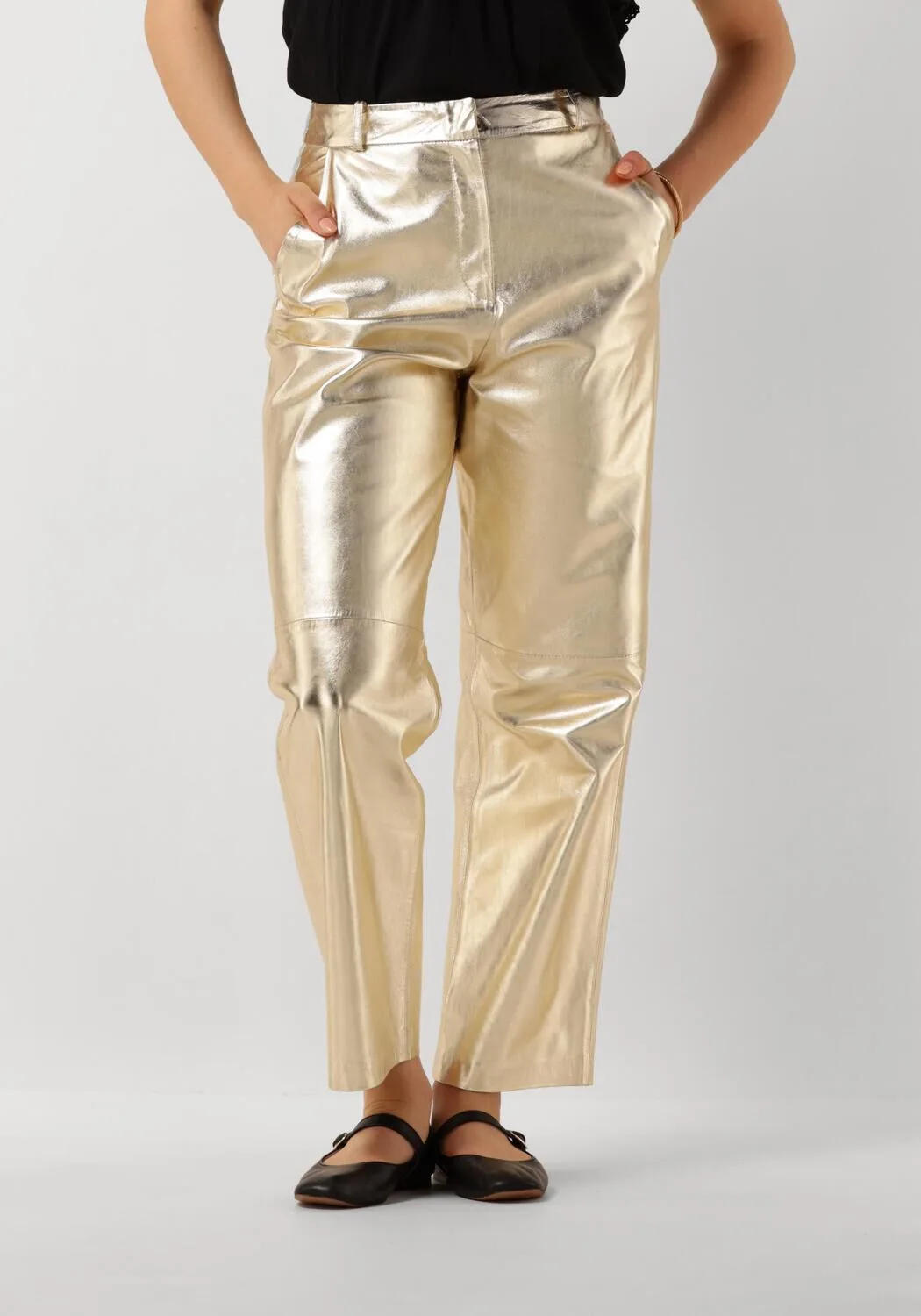 Shine bright like a diamond in deze IBANA PERFECTA METALLIC pantalon! Het goudkleurige leer aan de buitenkant zorgt voor een luxe uitstraling en een comfortabele pasvorm. Draag deze broek naar een chique diner of een feestje en steel de show. Combineer de pantalon met een zwarte blouse en hoge hakken voor een elegante look. Met deze eyecatcher ben jij helemaal klaar voor een avond vol glamour en stijl. Laat je innerlijke diva stralen in deze prachtige pantalon van IBANA!