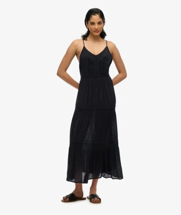 Ontspannen pasvorm - de klassieke pasvorm van Superdry. Niet te strak en niet te los. Precies goed. Kies je gebruikelijke maat. Vierkante halslijn met fijne schouderbandjes en lange pasvorm. Kantdetails op de borst en op de gehele rok. Rok met meerdere lagen en een metalen merklabel aan de achterkant. De lange spaghettijurk Ibiza heeft alles om te plezieren. Versierd met delicate kant en voorzien van een rok met meerdere lagen volgt deze jurk je bewegingen met gracia en elegantie. Je kunt het dragen met sandalen voor een eenvoudige en trendy outfit.