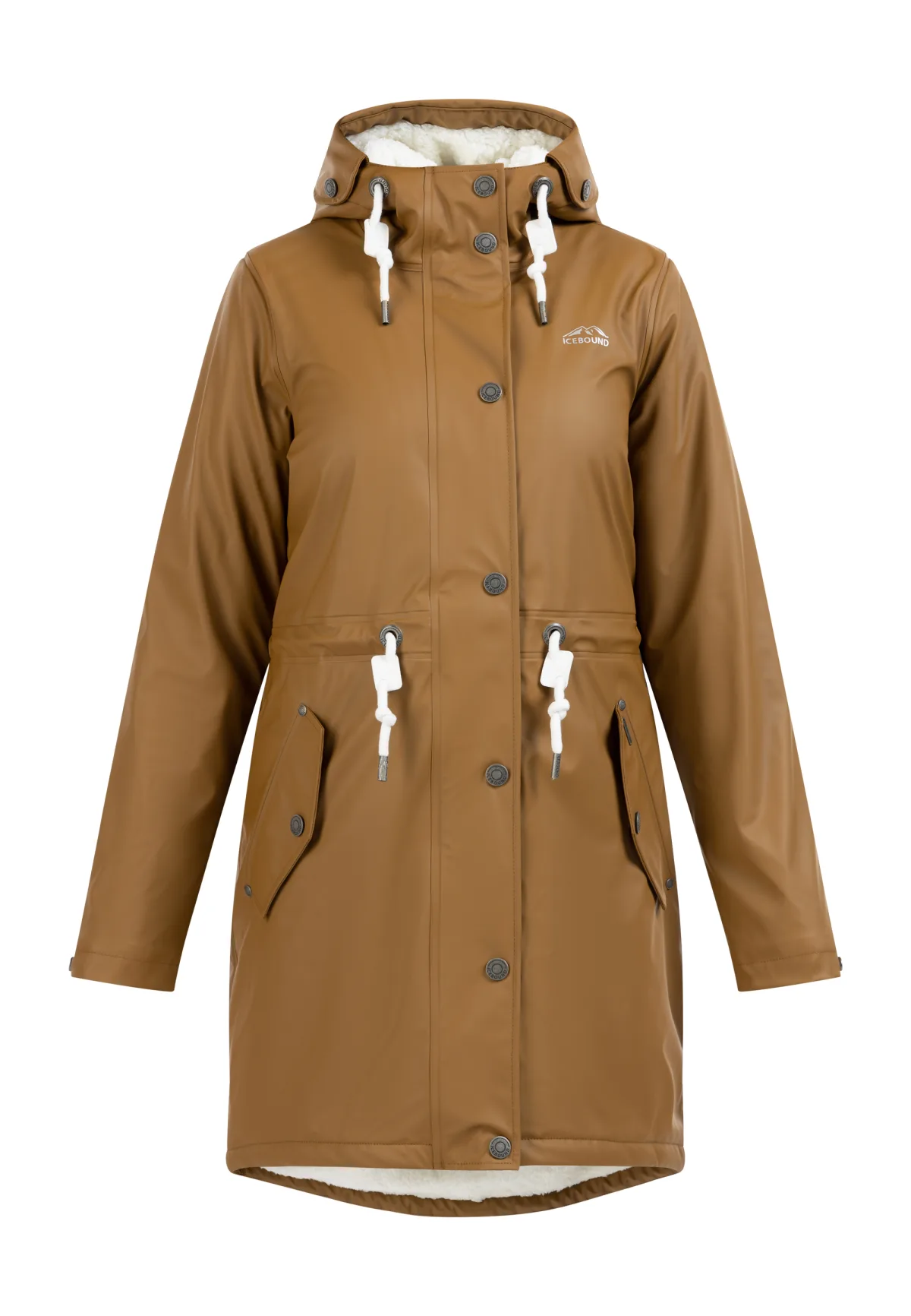De ICEBOUND regenjas met zachte teddyvoering biedt je de zekerheid dat je ook op regenachtige en koude dagen goed beschermd het huis kunt verlaten. Het heeft een gecoat materiaal dat wind- en waterdicht is, plus gesealde naden die gegarandeerd geen vocht doorlaten. De grote capuchon met gegraveerde oogjes en stijlvolle koorden heeft extra regenbescherming, wat vooral handig is op stormachtige dagen. De drukknoopsluiting boven de ritssluiting en de klepzakken optimaliseren de jas ook op het gebied van weersbestendigheid. Door de zachte teddy voering is hij comfortabel om te dragen. De typische ICEBOUND ijsbergprint op de borst en de met het logo gegraveerde drukknopen symboliseren bescherming en design. Mackintosh met teddy-look geweven bontvoering