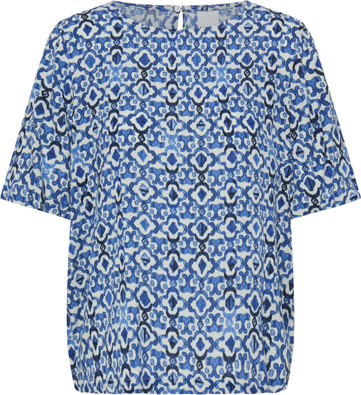 De Blouse Marrakech van Ichi is een stijlvolle dames blouse met een opvallend grafisch patroon. Het kledingstuk heeft een ronde halslijn en een losse, relaxte pasvorm, ideaal voor een casual look. De korte mouwen maken deze blouse perfect voor elke gelegenheid.