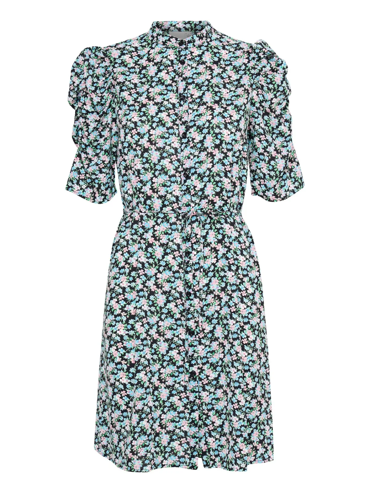 Design: Siernaad; Type sluiting: Knoopsluiting; Motief: Bloemenprint; Kraag: Opstaande kraag; Details: Gedrapeerd; Extra's: Applicaties, Voelt zacht aan; Lengte: Knielengte; Snit: Getailleerd; Pasvorm: Normale pasvorm; Armlengte: Halve mouw; Lengte: Normale lengte