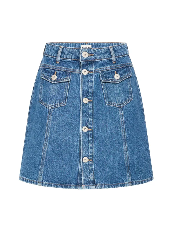 Design: Gevoerde zoom/rand, Knop placket, Opgezette zakken; Type sluiting: Knoopsluiting; Materiaal: Denim; Motief: Effen; Rokvorm: A-lijn rok; Extra's: Contrasterende naden, Label patch/label flag, Gewassen effect, Vaste grip; Lengte: Kort/mini; Pasvorm: Normale pasvorm; Taillehoogte: High waist