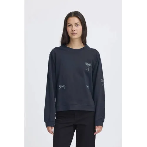 Deze ICHI IHMARROT trui heeft rechte mouwen en een ronde hals. Deze damestrui is gemaakt van katoen en heeft borduursels en een strik op de voorkant.