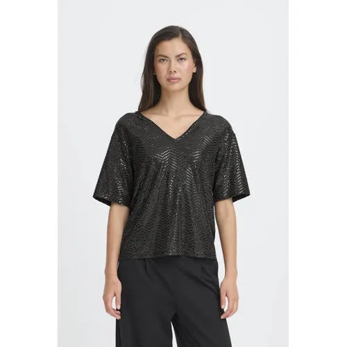Deze IHNELENIA top van ICHI heeft korte rechte mouwen en een V-hals. De top is gemaakt van polyester en heeft glitters, lurex en pailletten.