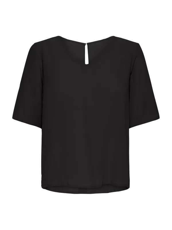 Blouse type: Blouseshirt; Design: Gevoerde zoom/rand, Keyholesluiting; Type sluiting: Knoopsluiting; Materiaal: Viscose; Motief: Effen; Kraag: Zonder kraag; Details: Cut-outs; Extra's: Op staal naden, Lichte stof; Pasvorm: Normale pasvorm; Armlengte: Halve mouw; Lengte: Normale lengte