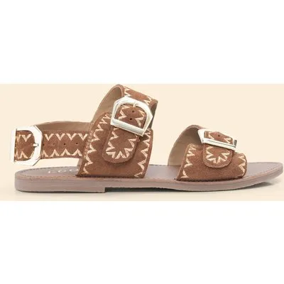 ICode Camel Leather Velour Embroidered Flat Sandals Camel Prijzen