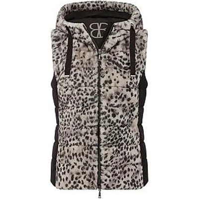 Iets getailleerde bodywarmer van BASLER het nepbont met sneeuwluipaardprint voor en achter springt meteen in het oog. Unikleurige inzetten aan beide kanten opzij zorgen voor een afkledend effect. Capuchon met strikbandjes, 2-wegritssluiting en naadzakken. Buitenkant en voering 100% polyester. Wattering 100% polyester (gerecycled). Lengte ca. 60 cm. Chemische reiniging. niet wasbaar. chloorbleken niet mogelijk. niet strijken. chemische reiniging, veilig. drogen in de droger niet mogelijk. 36, 38, 40, 42, 44, 46, 48, 50, 52