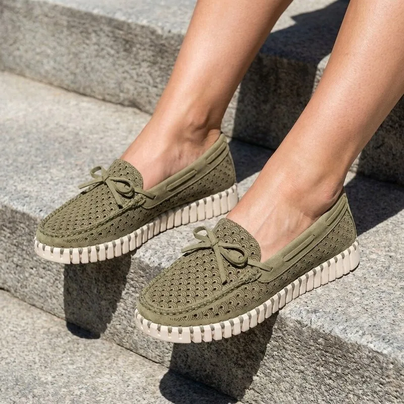 Geef je outfit een frisse en zomerse uitstraling met deze groene instappers van Ilse Jacobsen voor dames. De schoenen vallen op door het verfijnde patroon en het lichte ontwerp, wat zorgt voor een speelse en stijlvolle look. Dankzij het instapmodel en het strikdetail op de wreef trek je ze gemakkelijk aan en combineer je ze moeiteloos met je favoriete casual outfits.