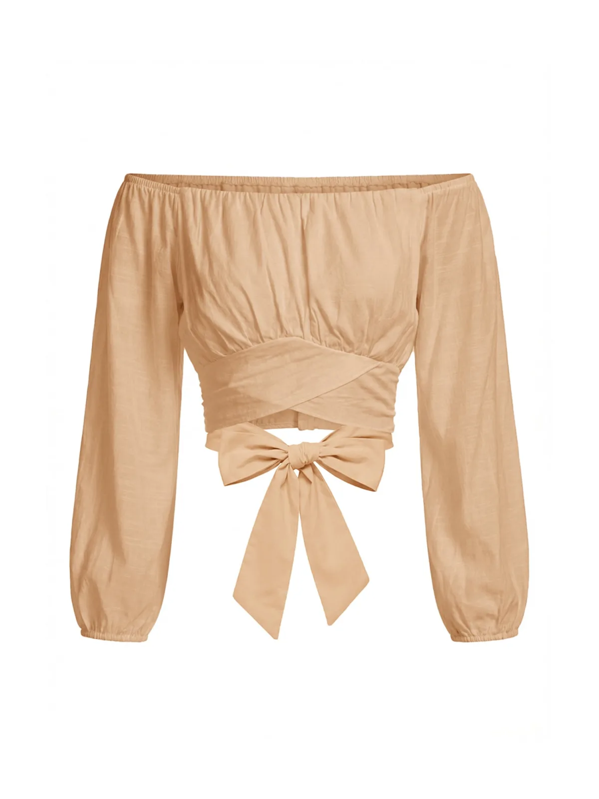 Blouse type: Blouseshirt; Design: Strapless/off-shoulder, Om te knopen/binden; Materiaal: Viscose; Motief: Effen; Kraag: Zonder kraag; Details: Cut-outs, Gedrapeerd; Extra's: Op staal naden, Koele grip; Pasvorm: Normale pasvorm; Armlengte: Lange mouw; Lengte: Korte pasvorm