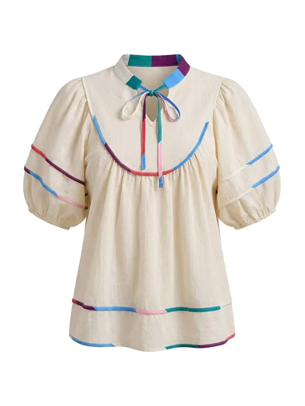 Blouse type: Blouseshirt; Design: Om te knopen/binden; Materiaal: Katoen; Kraag: Tuniek kraag; Details: Gedrapeerd; Extra's: Voelt zacht aan; Pasvorm: Normale pasvorm; Armlengte: Halve mouw; Lengte: Normale lengte