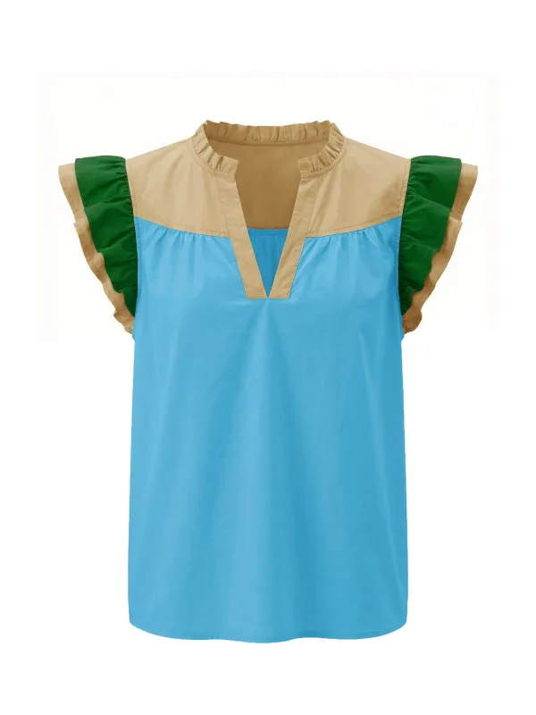 Blouse type: Blouseshirt; Design: Recht model; Materiaal: Katoen; Motief: Color-Blocking; Kraag: Tuniek kraag; Details: Ruches, Volant, Gedrapeerd; Extra's: Op staal naden; Pasvorm: Normale pasvorm; Armlengte: Mouwloos; Lengte: Normale lengte