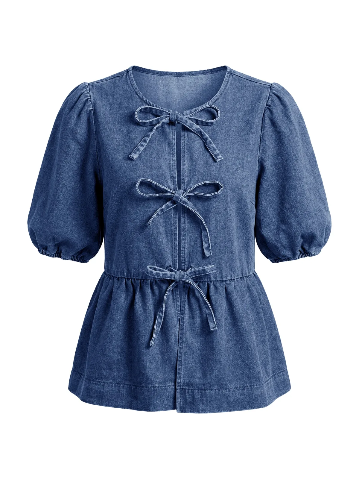 Blouse type: Wijde blouse; Design: Gevoerde zoom/rand, Pofmouwen, Om te knopen/binden; Materiaal: Denim; Motief: Effen; Kraag: Zonder kraag; Details: Gedrapeerd; Extra's: Gewassen effect, Vaste grip; Pasvorm: Normale pasvorm; Armlengte: Halve mouw; Lengte: Normale lengte