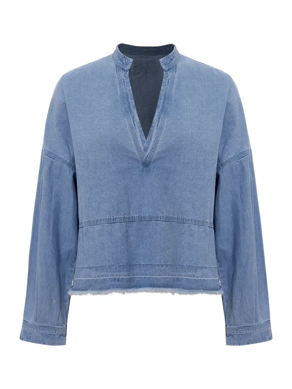 Blouse type: Blouseshirt; Design: Gefranjerde zoom, Overcut schouder; Materiaal: Denim; Halstype: V-hals; Motief: Effen; Kraag: Tuniek kraag; Details: Plooien; Extra's: Op staal naden, Vaste grip; Pasvorm: Losse pasvorm; Armlengte: Lange mouw; Lengte: Normale lengte
