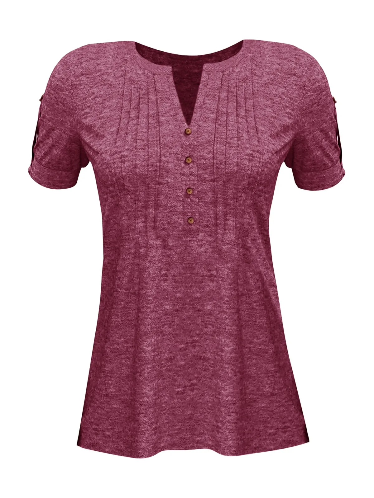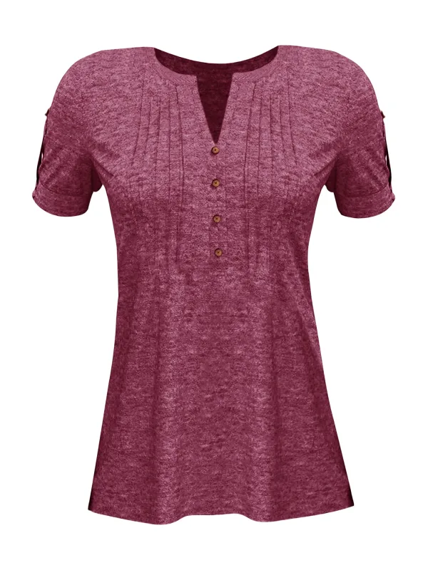 Blouse type: Wijde blouse; Design: Knop placket; Type sluiting: Knoopsluiting; Motief: Effen; Kraag: Tuniek kraag; Details: Plooien; Extra's: Huidvriendelijk materiaal; Pasvorm: Normale pasvorm; Armlengte: Kwartmouw; Lengte: Normale lengte