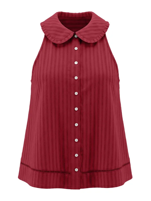 Blouse type: Klassieke blouse; Design: Knop placket; Type sluiting: Knoopsluiting; Motief: Effen; Kraag: Peter pan kraag; Details: Ruches, Borduursels, Gedrapeerd, Mesh; Extra's: Op staal naden; Pasvorm: Normale pasvorm; Armlengte: Mouwloos; Lengte: Normale lengte