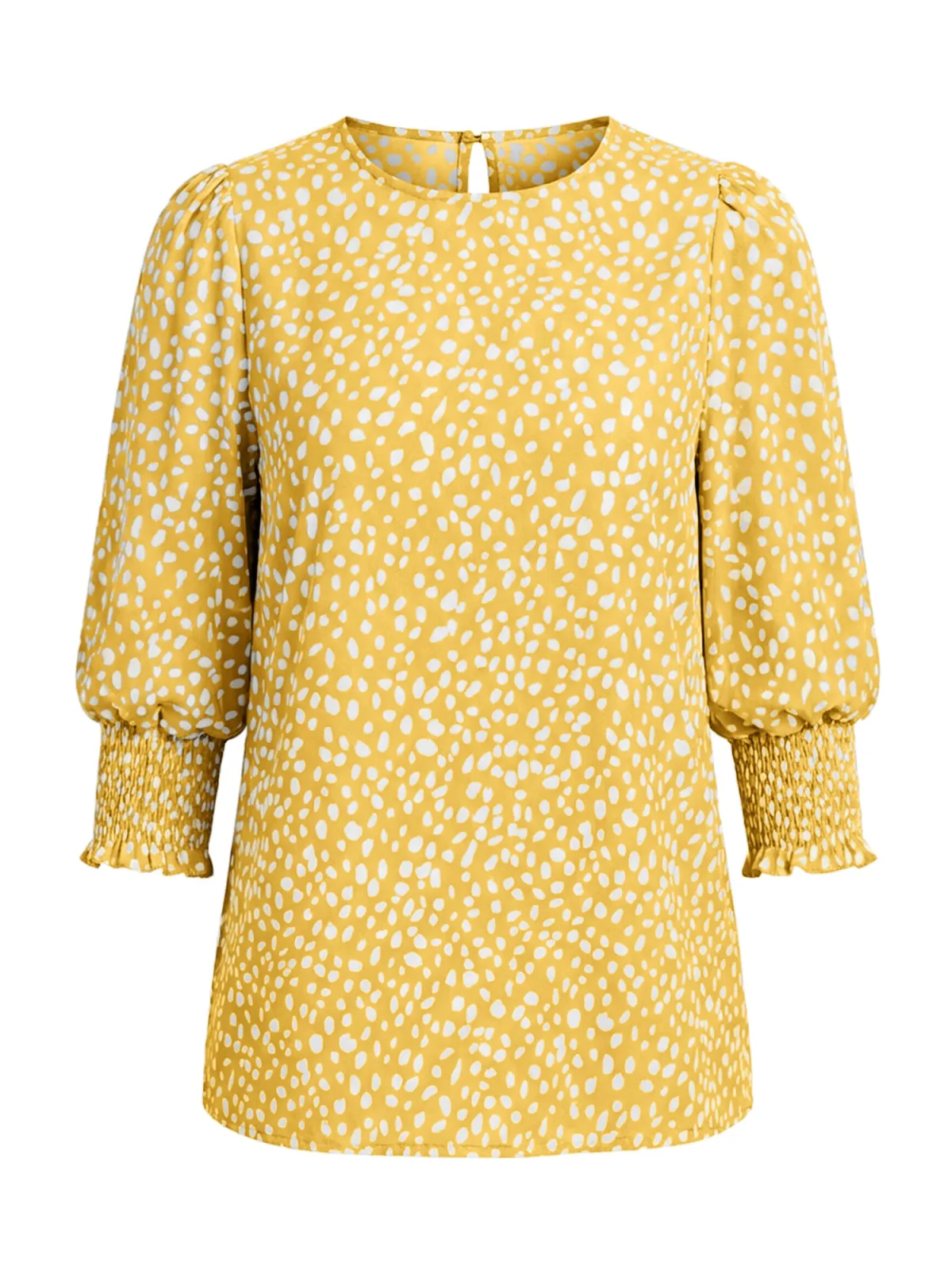 Blouse type: Blouseshirt; Design: Gevoerde zoom/rand, Keyholesluiting; Type sluiting: Knoopsluiting; Motief: Gestippeld; Kraag: Zonder kraag; Details: Cut-outs, Ruches, Gedrapeerd; Extra's: All-over patroon, Voelt zacht aan; Pasvorm: Normale pasvorm; Armlengte: Driekwart mouw; Lengte: Normale lengte