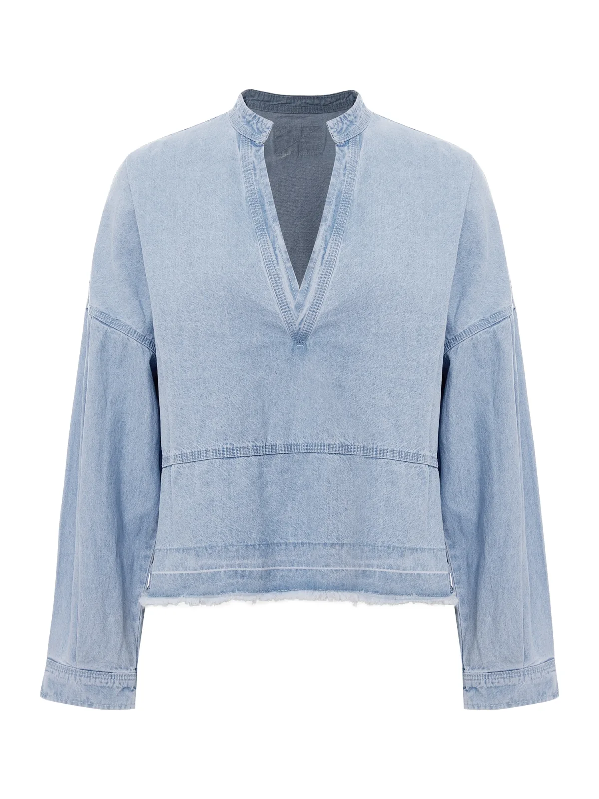 Blouse type: Blouseshirt; Design: Ronde zoom, Overcut schouder; Materiaal: Denim; Halstype: V-hals; Motief: Effen; Kraag: Tuniek kraag; Details: Plooien; Extra's: Op staal naden; Pasvorm: Losse pasvorm; Armlengte: Lange mouw; Lengte: Normale lengte