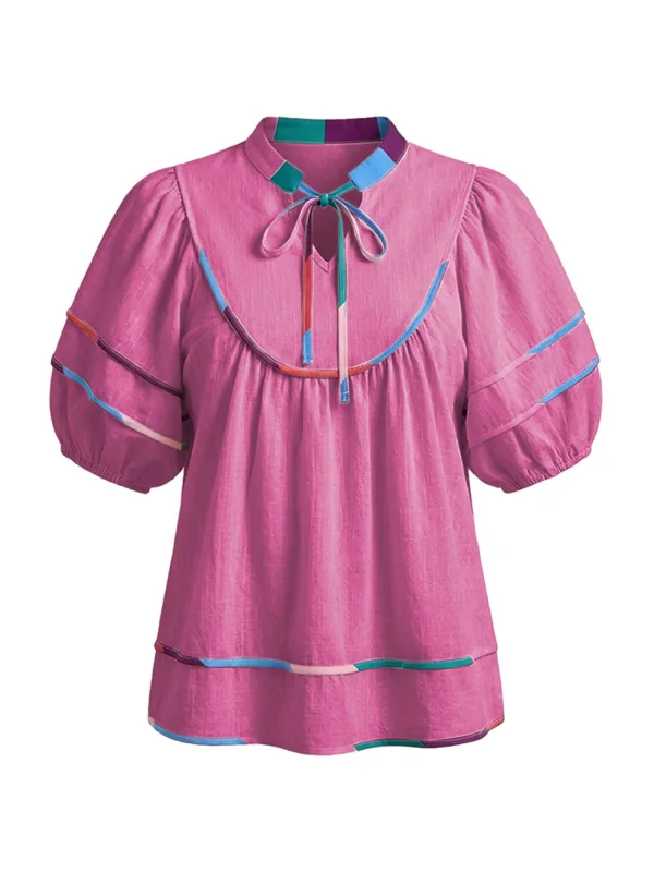 Blouse type: Blouseshirt; Design: Gevoerde zoom/rand, Pofmouwen, Contrasterende inserts; Materiaal: Katoen; Motief: Effen; Kraag: Tuniek kraag; Details: Gedrapeerd; Extra's: Op staal naden, Voelt zacht aan; Pasvorm: Normale pasvorm; Armlengte: Halve mouw; Lengte: Normale lengte