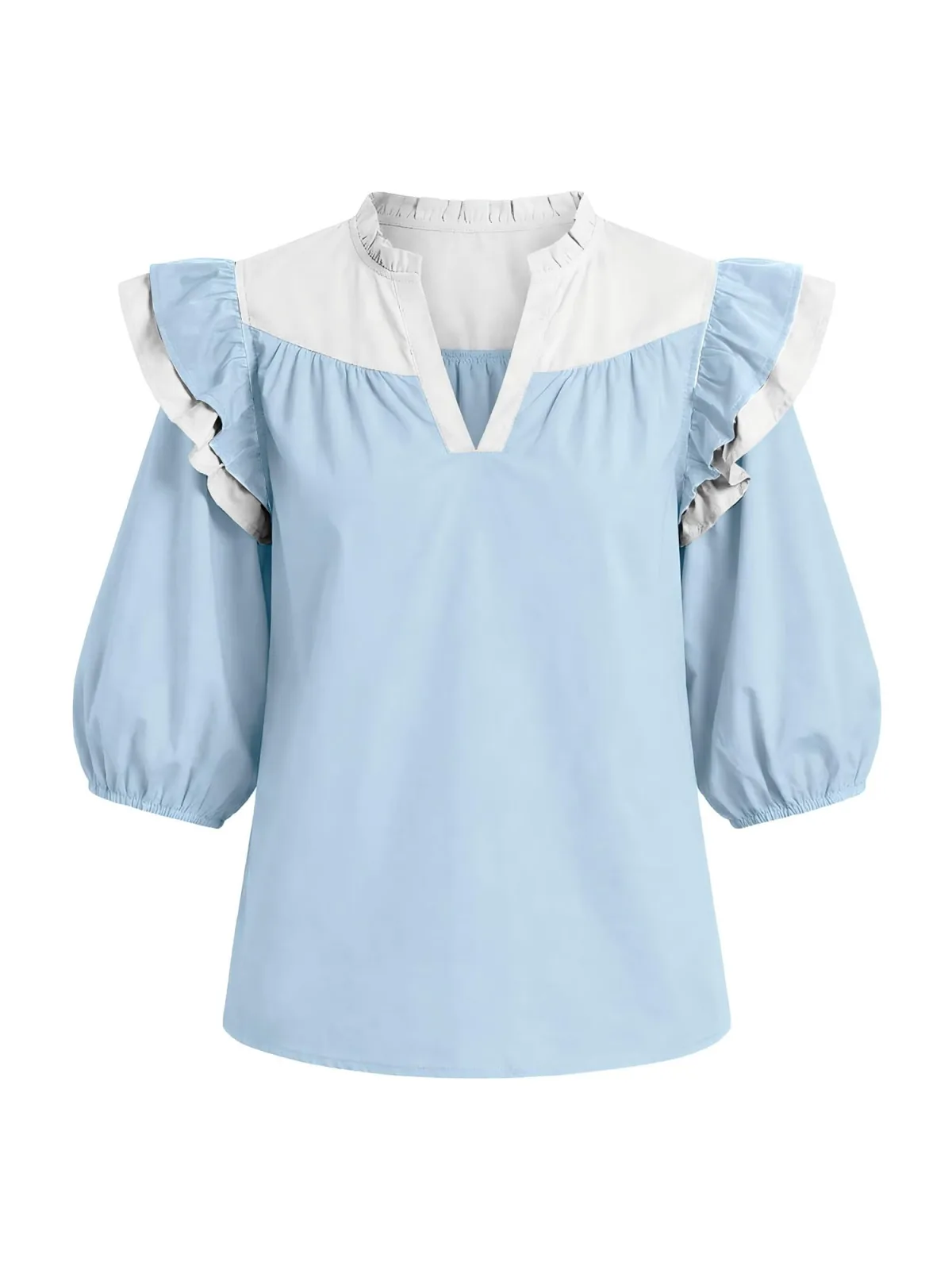 Blouse type: Blouseshirt; Design: Gevoerde zoom/rand, Pofmouwen, Elastische inzetstukken; Materiaal: Katoen; Motief: Color-Blocking; Kraag: Tuniek kraag; Details: Ruches, Gedrapeerd; Extra's: Op staal naden, Voelt zacht aan; Pasvorm: Losse pasvorm; Armlengte: Halve mouw; Lengte: Normale lengte
