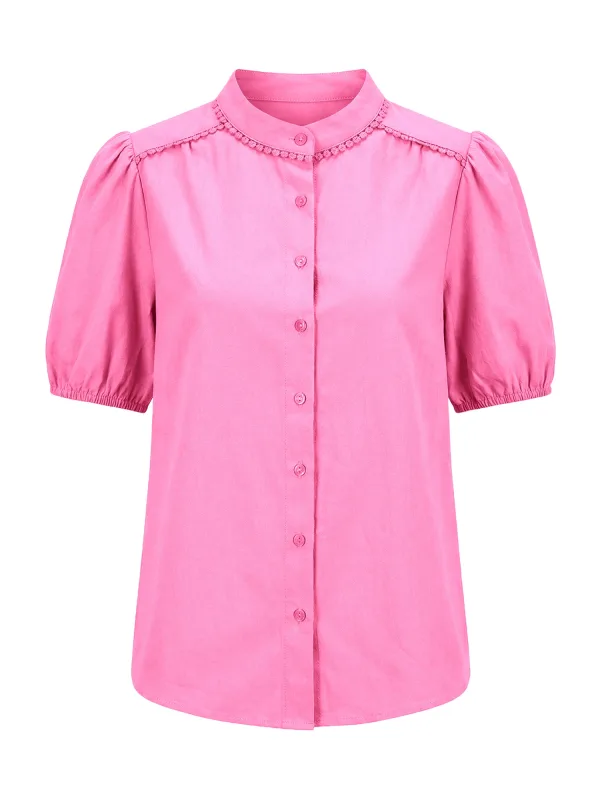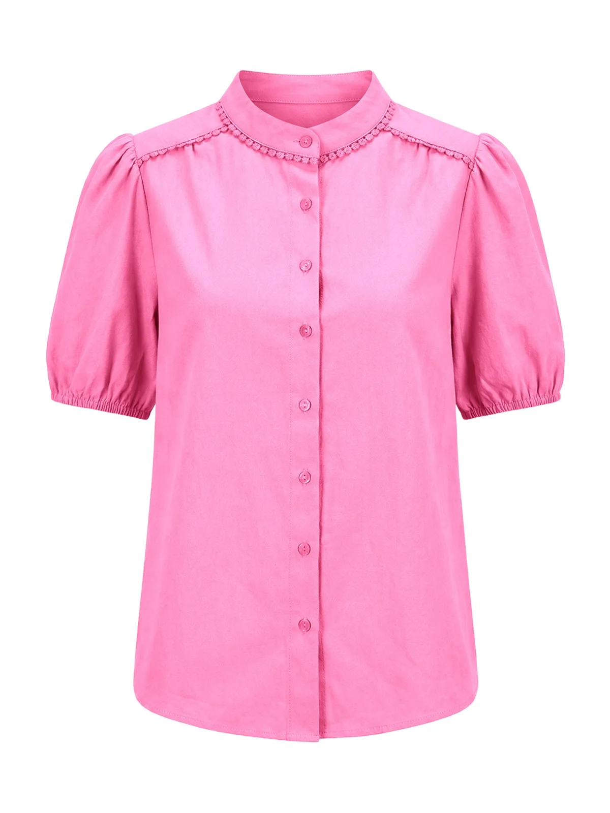 Blouse type: Klassieke blouse; Design: Pofmouwen; Type sluiting: Knoopsluiting; Materiaal: Katoen; Motief: Effen; Kraag: Opstaande kraag; Details: Kant, Gedrapeerd; Extra's: Op staal naden; Pasvorm: Normale pasvorm; Armlengte: Halve mouw; Lengte: Normale lengte