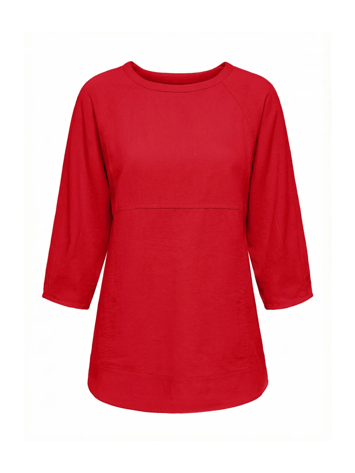 Blouse type: Blouseshirt; Design: Ingelegde zoom/rand, Raglanmouwen, Ronde zoom; Materiaal: Katoen; Motief: Effen; Kraag: Zonder kraag; Extra's: Op staal naden, Voelt zacht aan; Pasvorm: Losse pasvorm; Armlengte: Driekwart mouw; Lengte: Normale lengte