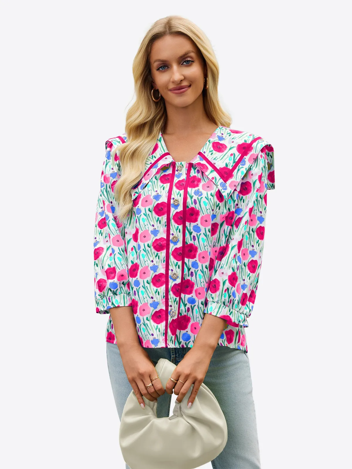 Blouse type: Klassieke blouse; Design: Gevoerde zoom/rand; Type sluiting: Knoopsluiting; Motief: Bloemenprint; Details: Gedrapeerd; Extra's: All-over patroon; Pasvorm: Losse pasvorm; Armlengte: Driekwart mouw; Lengte: Normale lengte