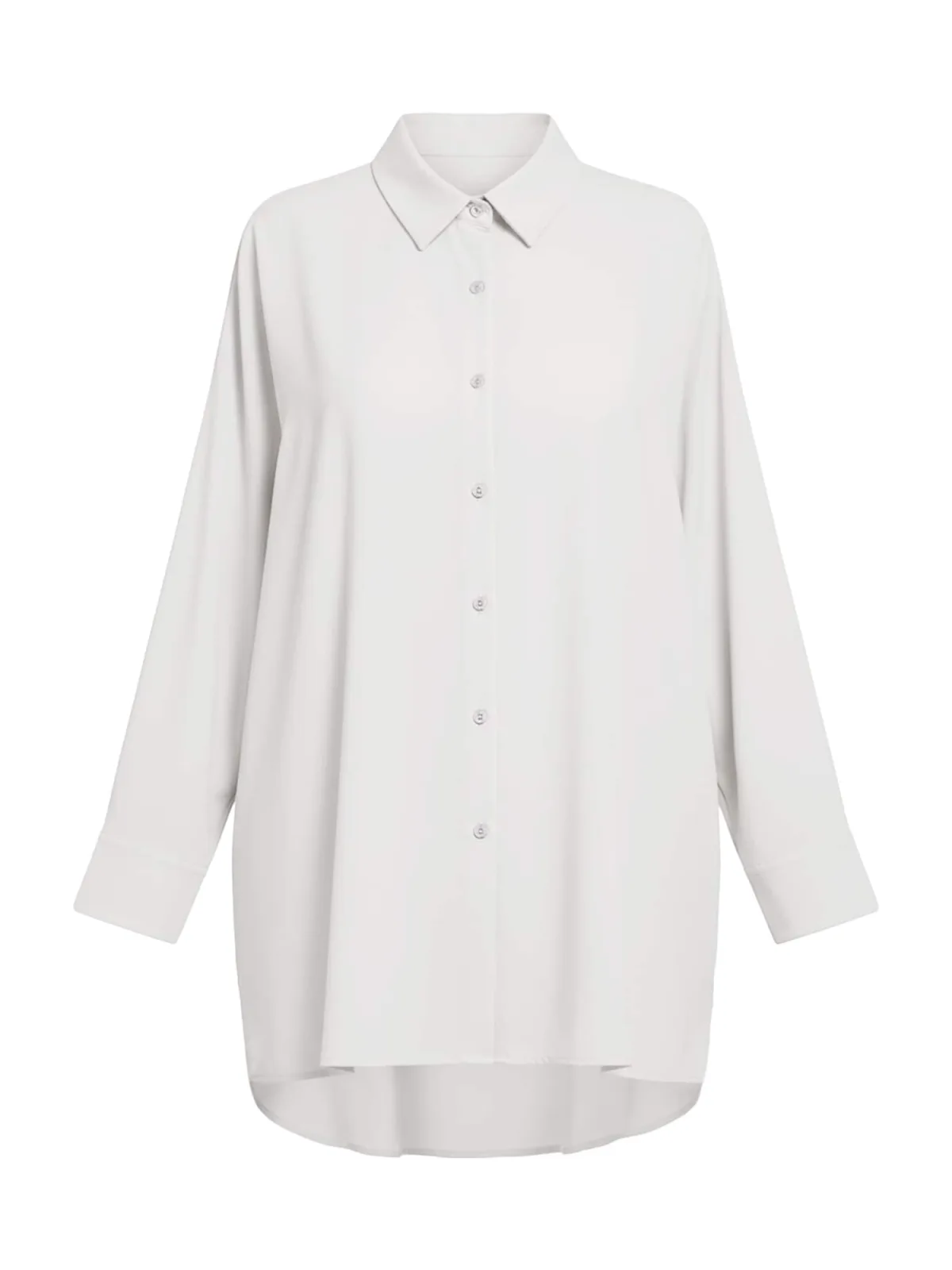 Blouse type: Klassieke blouse; Design: Verlengd rugpand; Type sluiting: Knoopsluiting; Motief: Effen; Kraag: Kentkraag; Extra's: Gladde stof; Pasvorm: Losse pasvorm; Armlengte: Lange mouw; Lengte: Lange pasvorm